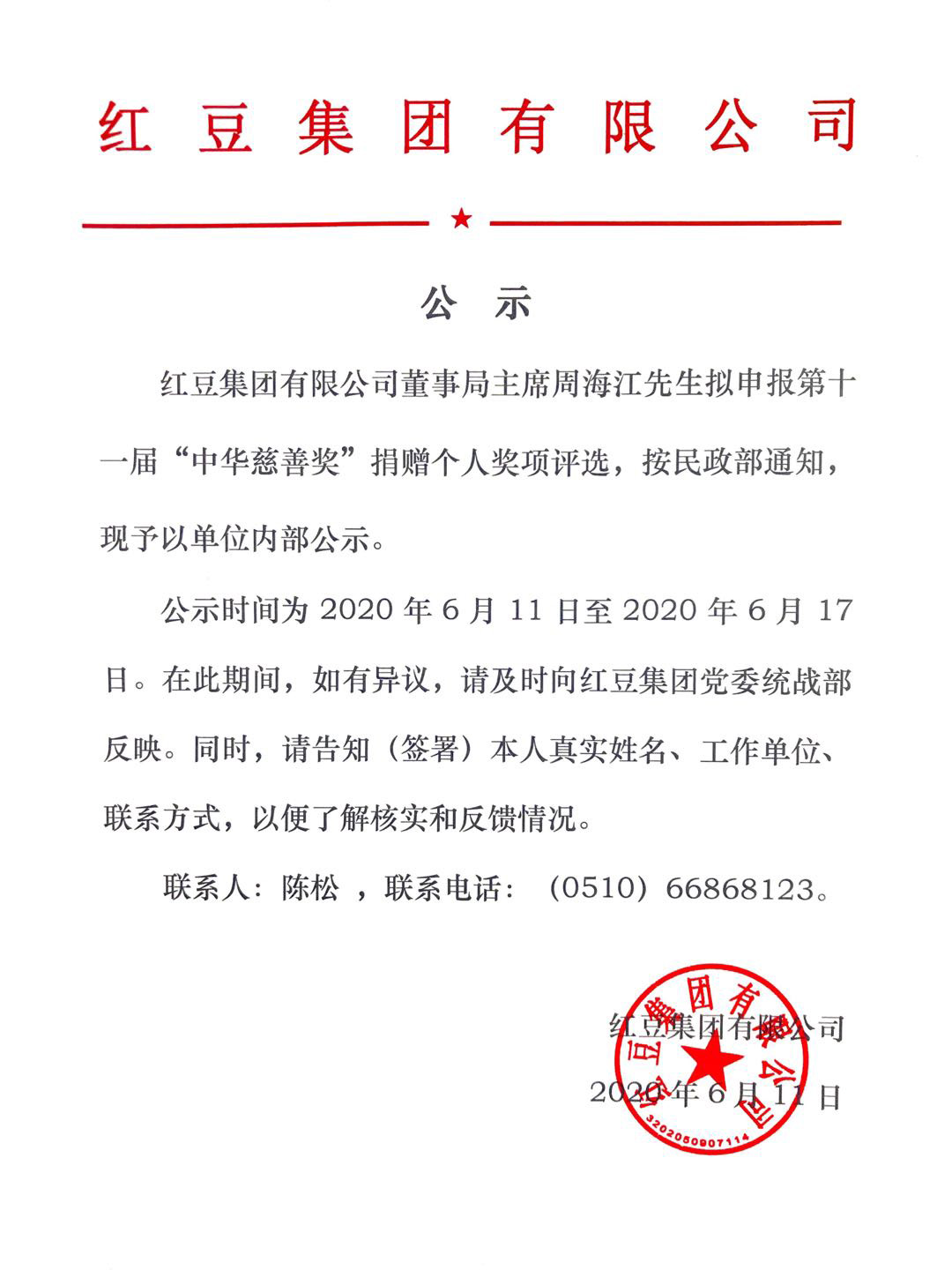 關(guān)于紅豆集團(tuán)董事局主席周海江申報(bào)第十一屆“中華慈善獎(jiǎng)”捐贈(zèng)個(gè)人獎(jiǎng)項(xiàng)評(píng)選的公示