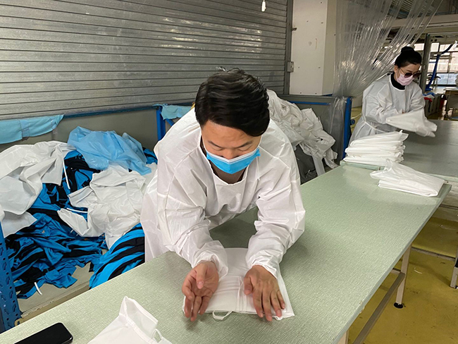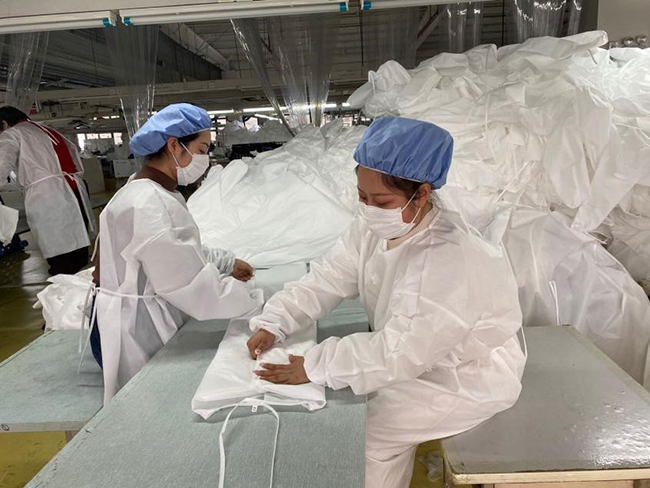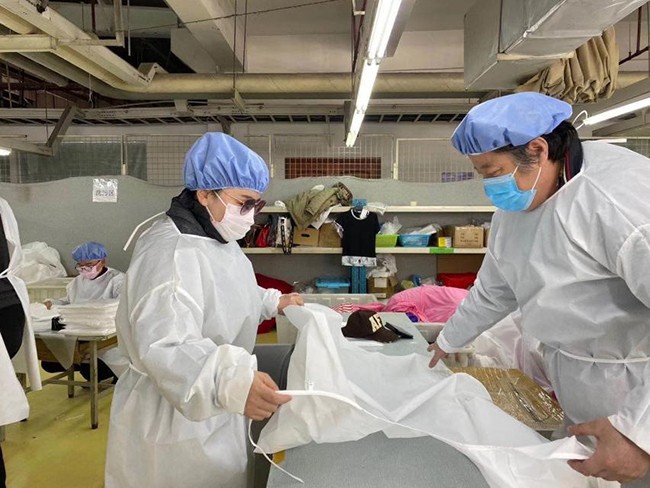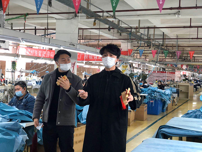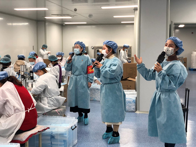 2月24日,紅豆藝術團團員在團長張波帶領下,奔赴生產一線,爭當一名普通志愿者,投身于紅豆防護服的生產包裝工作中。他們一邊親臨工廠體驗戰“疫”生活,一邊現場采訪奮戰在生產一線的優秀黨員干部和先進員工,收集紅豆戰“疫”的最新素材,為創作新作品鋪陳。