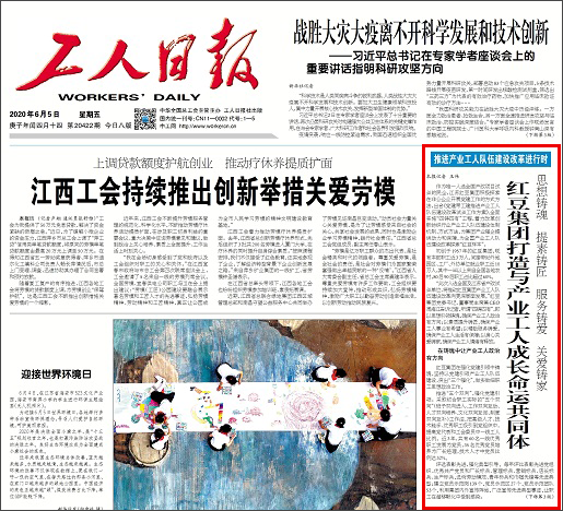 作為唯一入選全國產(chǎn)改項目試點的民企,江蘇紅豆集團積極探索在非公企業(yè)開展黨建工作的方式方法,出臺《黨建帶工建推進產(chǎn)業(yè)工人隊伍建設改革試點工作方案》,全面實施“四鑄四有”工程,著力改革創(chuàng)新紡織行業(yè)產(chǎn)業(yè)工人隊伍建設體制機制、方式方法,為集團產(chǎn)業(yè)強企提供動力和保障,為全國產(chǎn)業(yè)工人隊伍建設改革探索“紅豆樣本”。