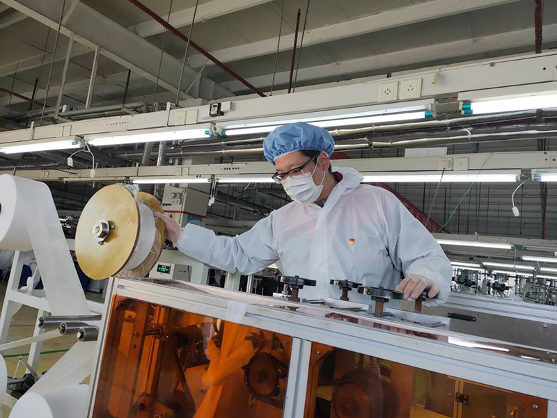 尚慶軍,紅豆黨員突擊隊的一位“拼命三郎”。已有9年黨齡的尚慶軍,不僅要做好疫情防控的“守門人”,檢測和登記每一位進出人員的體溫,同時早中晚三次還要對工廠的各個角落進行消毒,確保口罩生產線改造順利進行。“從2月2號開始上班,已經連續20多天沒有陪伴家人。”尚慶軍說,“看著原材料從入口進去,一只只潔白的口罩從出口自動下線,我就感覺特別激動,特想哭。”