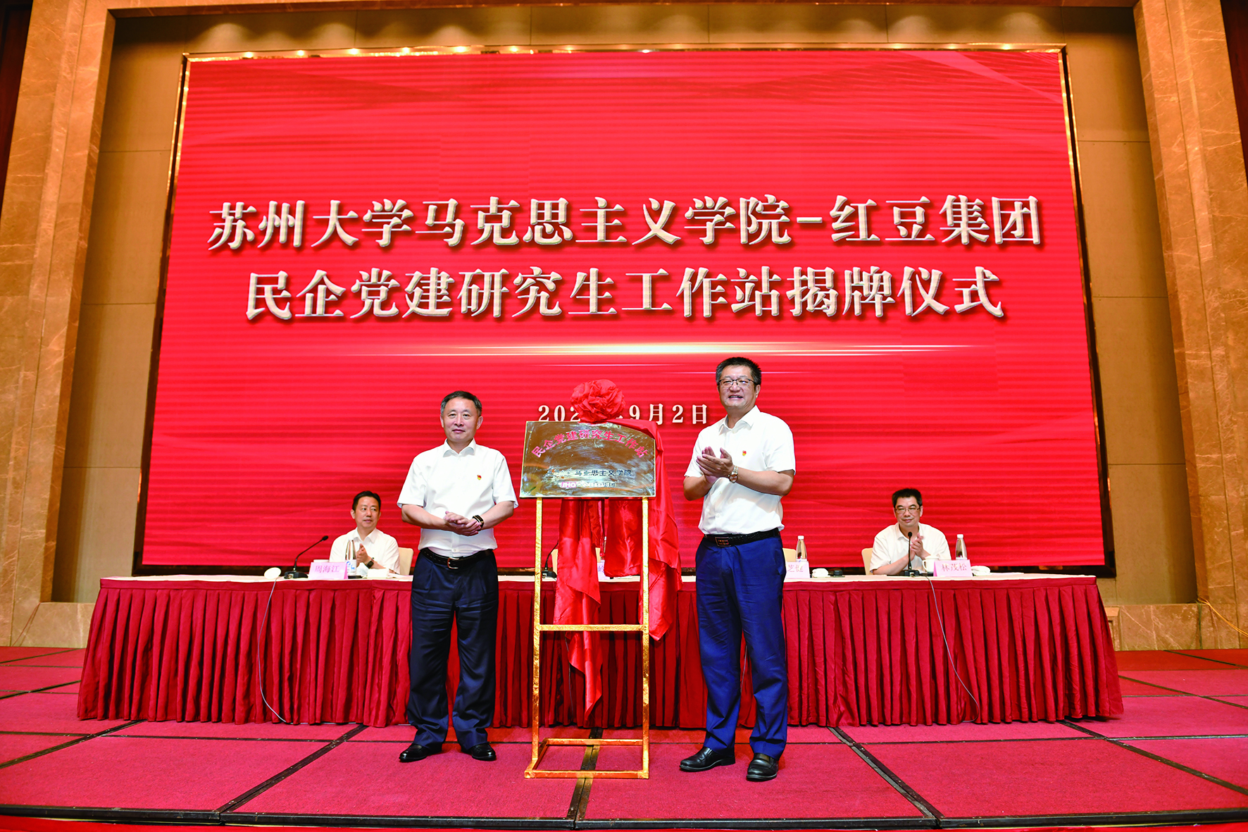 9月2日,無錫市“兩新”組織黨組織書記示范培訓(xùn)班在紅豆集團(tuán)開班。開班式上,蘇州大學(xué)馬克思主義學(xué)院—紅豆集團(tuán)民企黨建研究生工作站揭牌成立,無錫市委常委、組織部部長柏長嶺和蘇州大學(xué)馬克思主義學(xué)院院長田芝健共同揭牌。